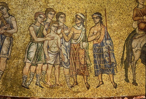 На мозаике мы видим, как братья вытаскивают Иосифа из рва и продают его Измаильтянам за двадцать серебренников.