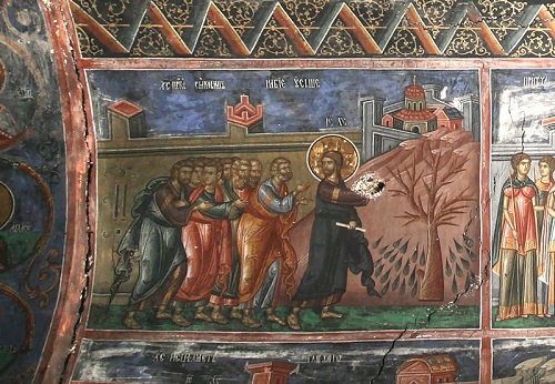 В Великий понедельник вспоминается также и проклятие Иисусом Христом греховной смоковницы, не приносящей ни истинного покаяния, ни молитв, ни веры. Вот как оно изображено на стенах собора Печской Патриархии в Косово.