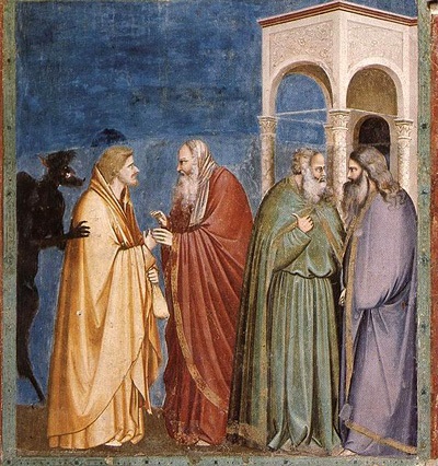 А вот Иуда получает плату за предательство на настенной росписи кисти Джотто, из капеллы Скровеньи (и как созвучно это событие прообразу — продаже Иосифа!):