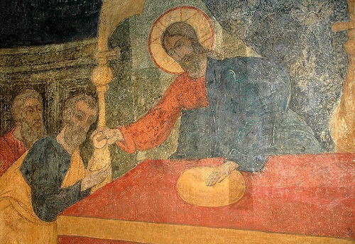 А здесь фреска из Москвы (в соборе Сретения Владимирской иконы Божией Матери. Сретенский монастырь) показывает нам причащение Апостолов: