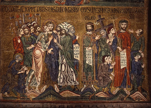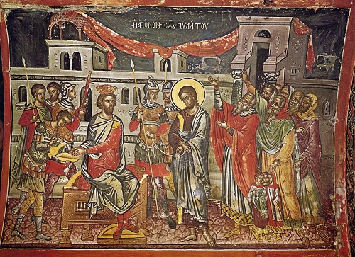 А здесь Христос уже перед Пилатом. И мы смотрим на фреску Феофана Критского, из монастырь Ставроникита на Афоне:
