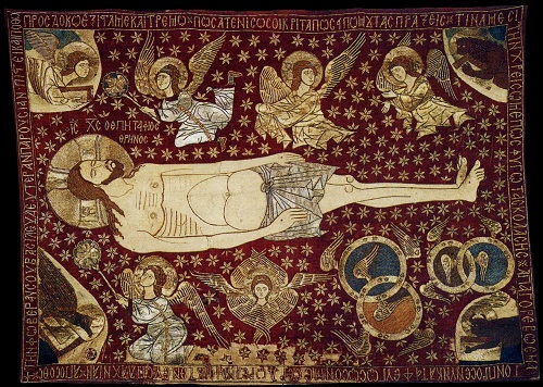 На утрени Великой Субботы после Великого славословия выносится священнослужителями из храма Плащаница. И вот Христос в окружении ангельских сил на Плащанице из монастыря Преображения Господня в греческих Метеорах: