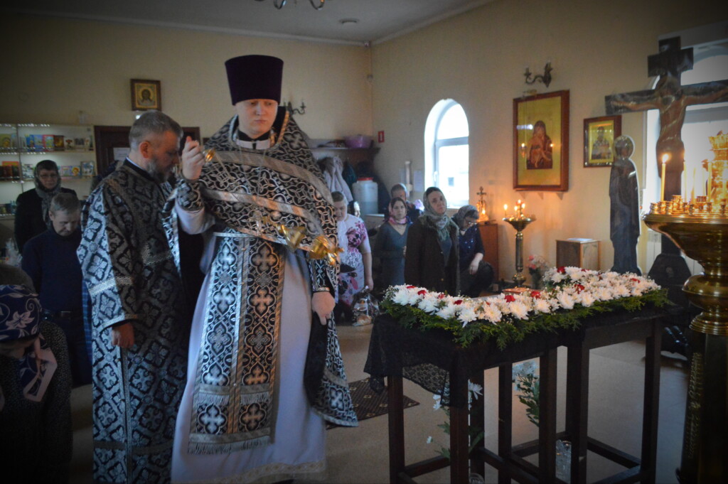 Накануне Великой Субботы, 14 апреля, священник Сергий Шальнов совершил Вечерню, во время которой в храм по традиции выносится Плащаница.