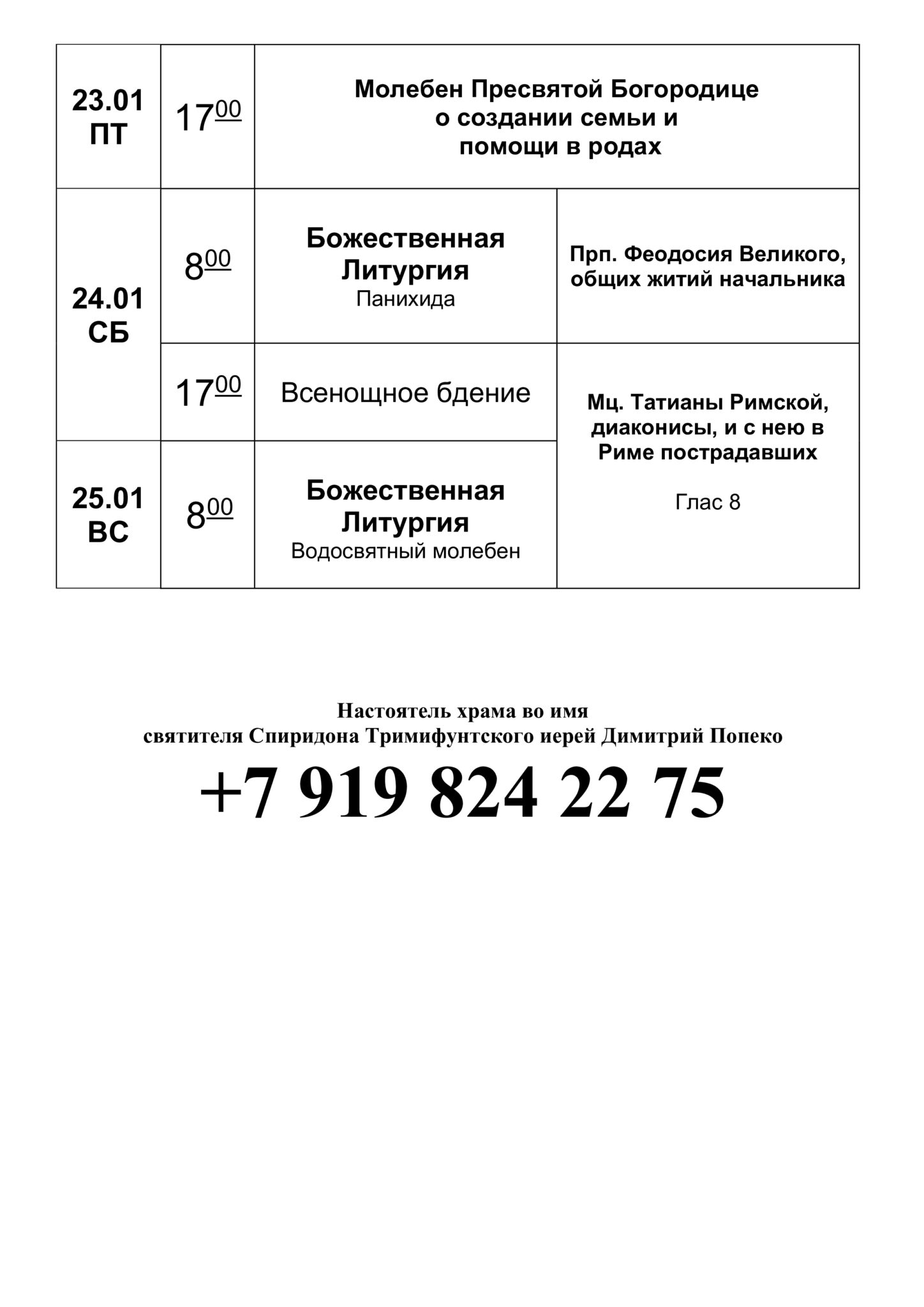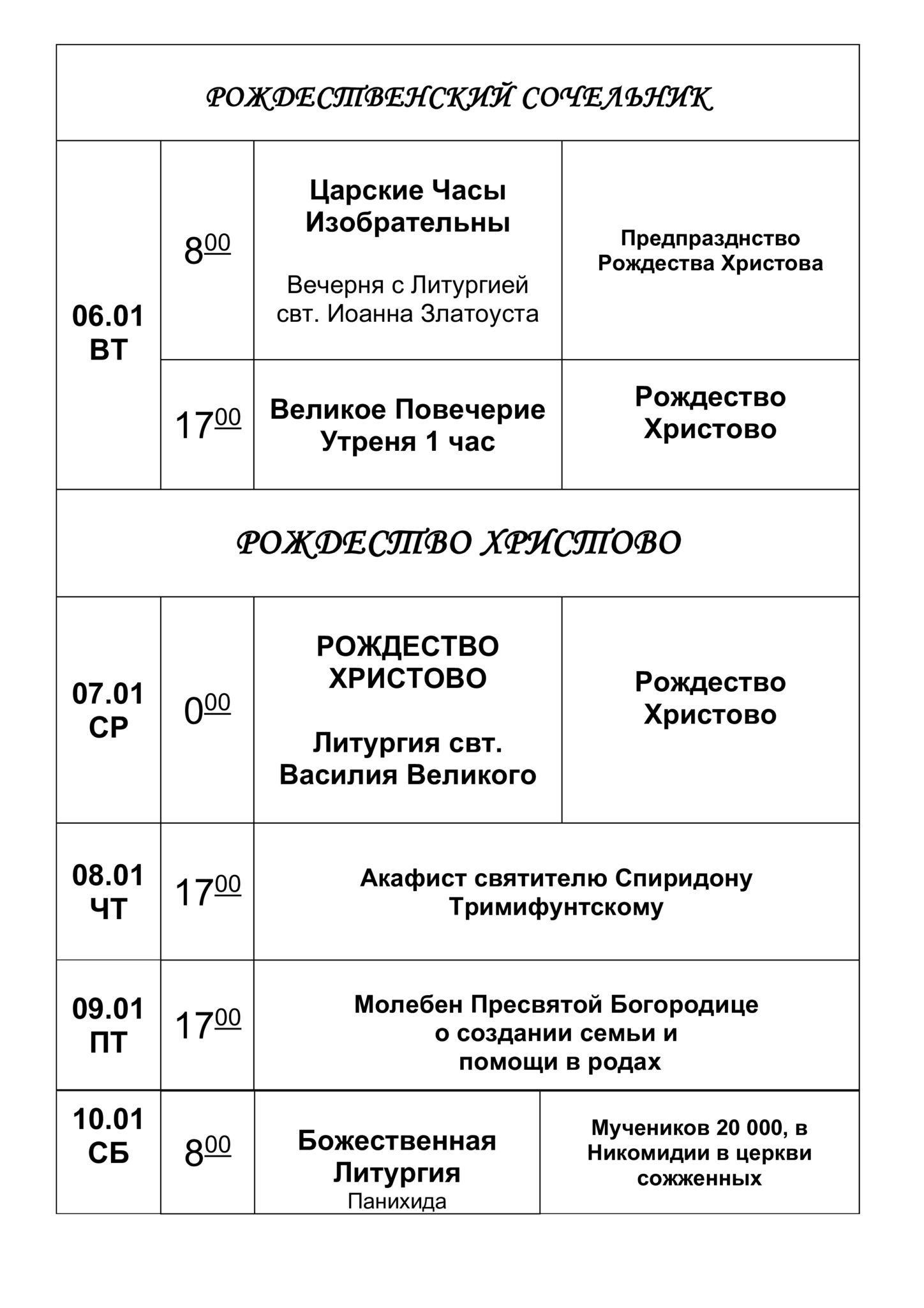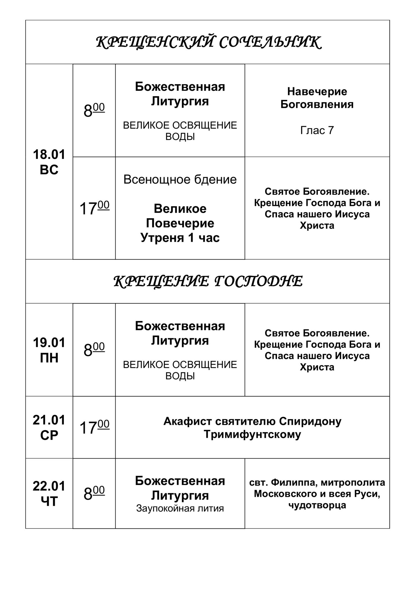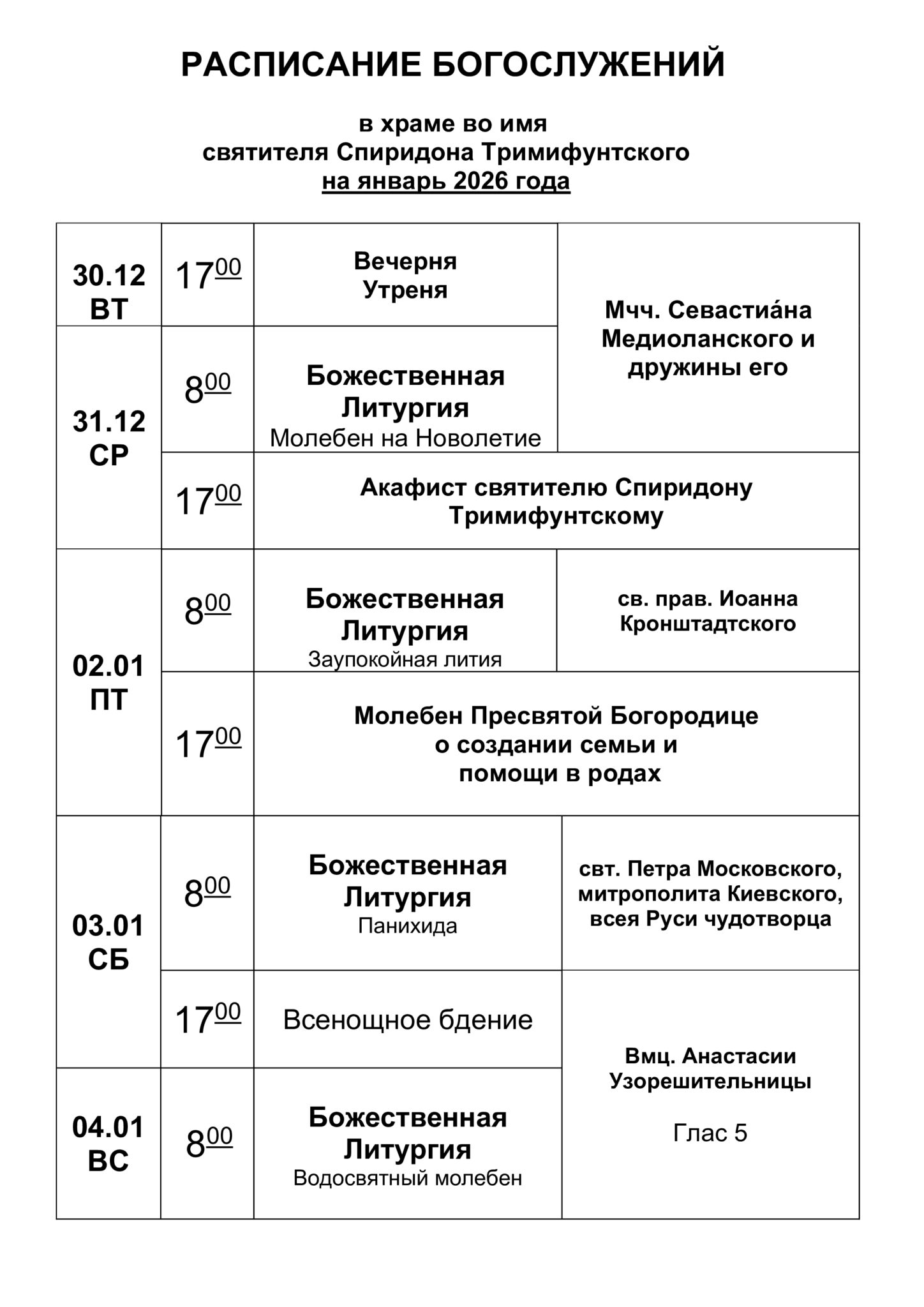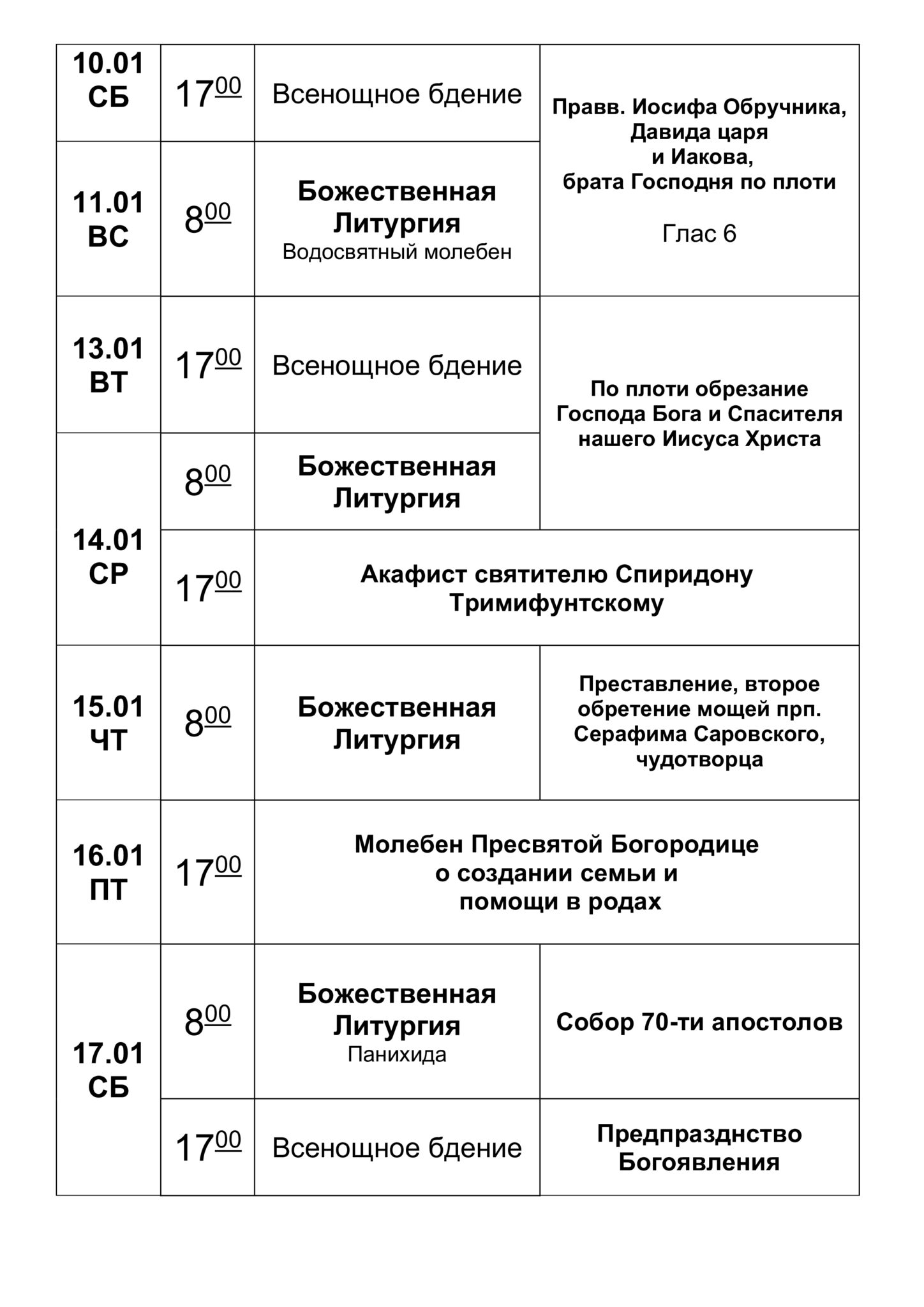 Расписание богослужений январь 2026 года